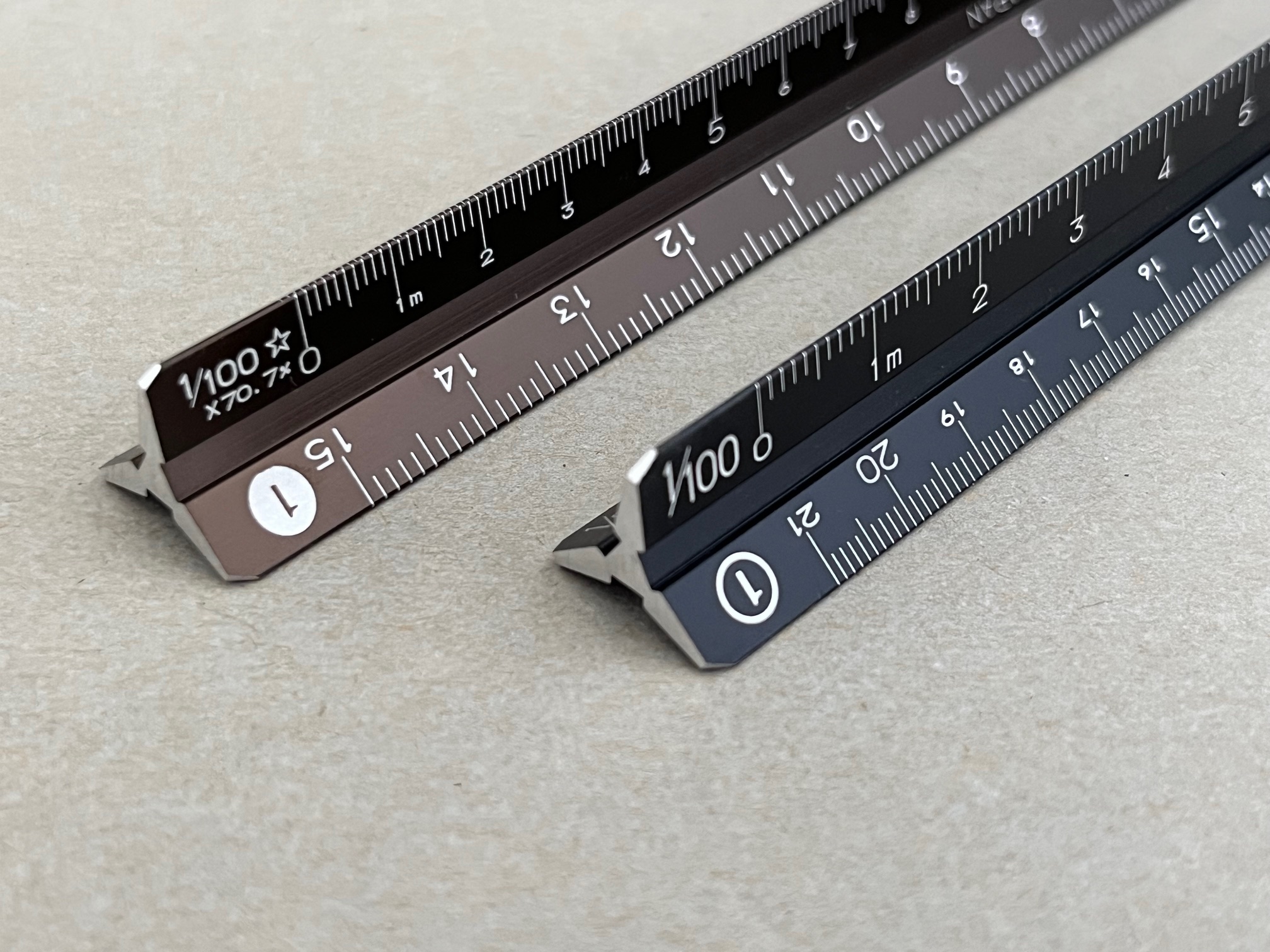 製品によっては、原寸の縮尺目盛りと、A列コピーダウンの縮尺目盛りが同じ面や近くに配置されています。これにより、元の図面とコピー図面を交互に確認する際も、スケールを持ち替える手間が少なく、高い作業効率を実現します。